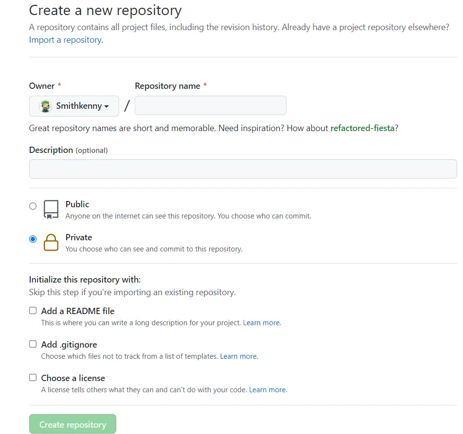 创建一个xxx.github.io的 public 仓库,这里的xxx写你的名字,比如我写的是 Smithkenny.github.io,那么到时我就可以通过 Smithkenny.github.io 来访问我的网站了。 创建完成之后,那么你就有自己的 Git 地址了。