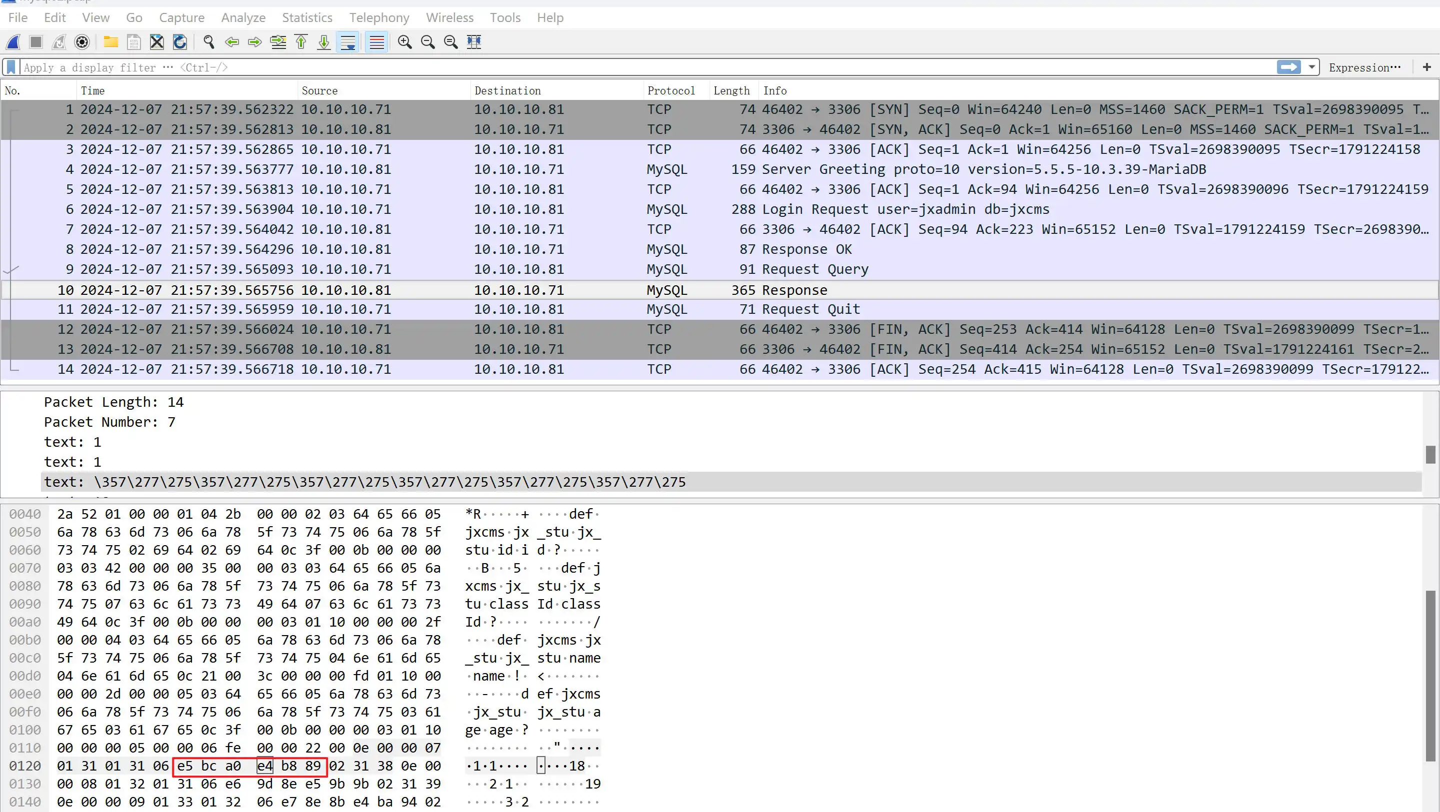 分段排查,这里在开发服务器上抓业务口的3306。分析MySQL包的响应包。